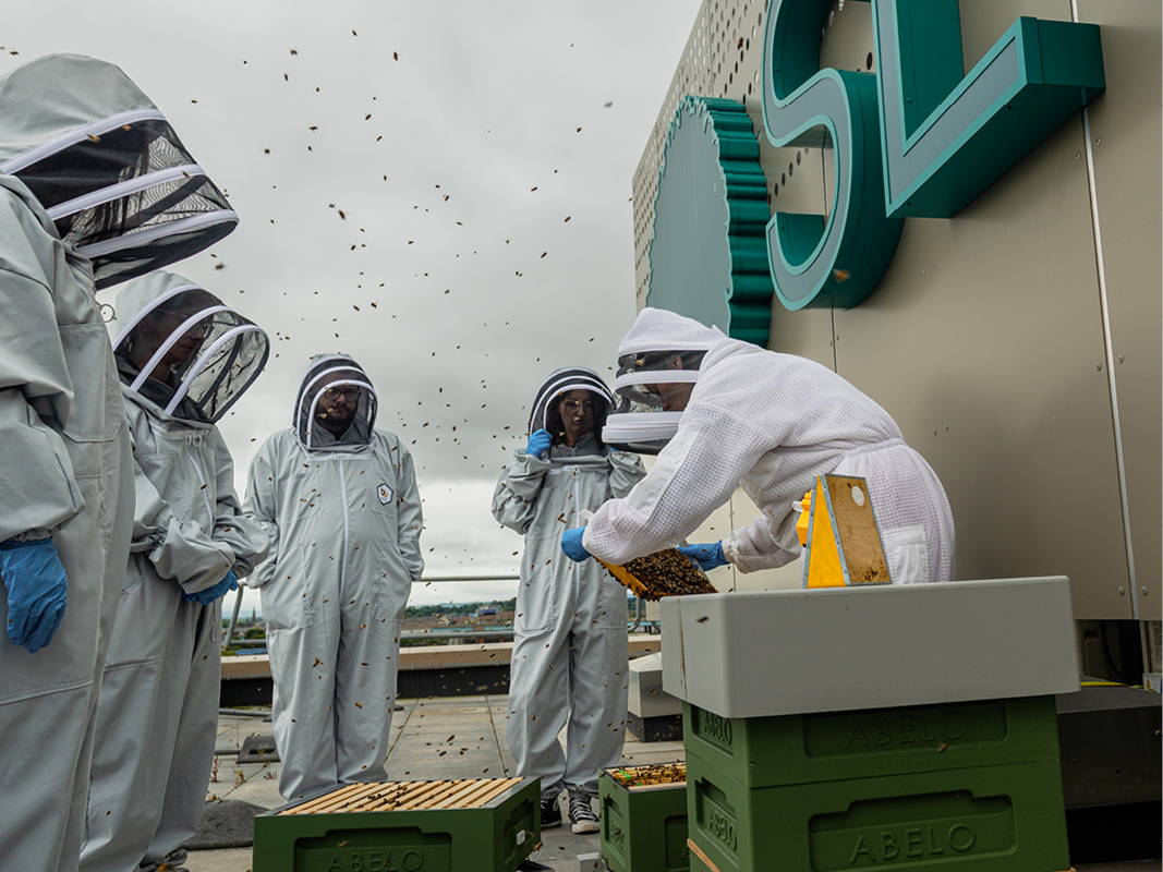 We support the Scottish Government Pollination strategy by hosting two thriving beehives on our roof at Clyde Place in Glasgow, joining the urban colonies already established in the city.